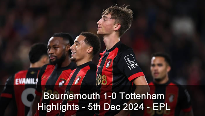 Bournemouth 1-0 Tottenham - Highlights - 5th Dec 2024 - Premier League (712 views)Watch Bournemouth 1-0 Tottenham highlights and Goals - 5th Dec 2024 - Premier League, You can also ...[read more]
