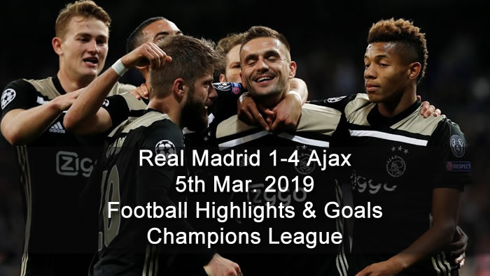 Watch football highlights and goals of Real Madrid 1-4 Ajax - Champions League - Real Madrid vs Ajax football highlights and goals 5th Mar. 2019. Live football streaming ended and the football highlights and goals were compiled for you. Maybe you did not watch the full match or want to watch it again then you can watch the football video highlights & goals below.