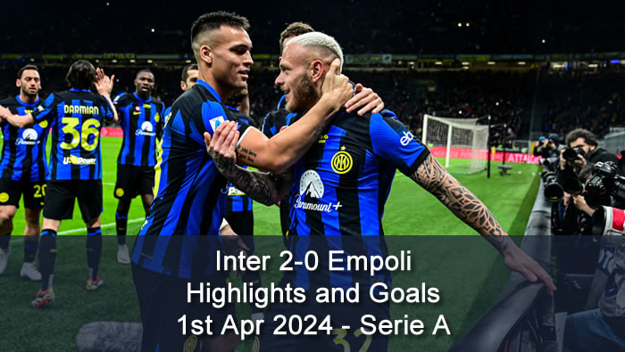 Watch Inter 2-0 Empoli Highlights and Goals 1st Apr 2024 - Serie A. Live football streaming ended, and the football highlights and goals were compiled for you. Maybe you did not watch the full match or want to watch it again, and then you can watch the football video highlights & goals below.